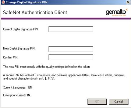 Current Digital Signature PIN: Εδώ καταχωρούμε τον τρέχον κωδικό ψηφιακής υπογραφής (από προεπιλογή έξι μηδενικά 000000).