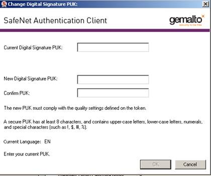 Current Digital Signature PUK: Εδώ καταχωρούμε τον τρέχον κωδικό διαχειριστή ψηφιακής υπογραφής (από προεπιλογή έξι μηδενικά 000000).