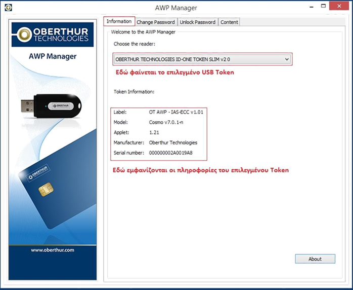 Η εφαρμογή AWP Manager είναι ένα βοηθητικό εργαλείο για την διαχείριση του USB Token όσον αφορά τους κωδικούς πρόσβασης και τα εγκατεστημένα πιστοποιητικά. Από την καρτέλα Information μπορούμε να δούμε χρήσιμες πληροφορίες για το USB Token όπως το μοντέλο και το σειριακό αριθμό.