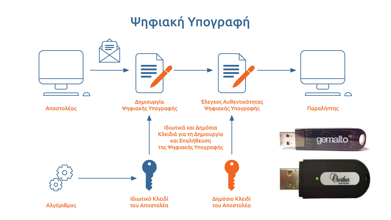 Τα USB Token μοιάζουν εξωτερικά με μνήμη USB Flash. Στην πραγματικότητα, πρόκειται για ειδικές ηλεκτρονικές συσκευές, στις οποίες αποθηκεύονται με ασφάλεια τα ψηφιακά πιστοποιητικά. Συνδέονται στη θύρα USB του υπολογιστή και παρέχουν τη δυνατότητα στον χρήστη να υπογράφει ψηφιακά έγγραφα, όπως pdf, word και άλλα αρχεία.